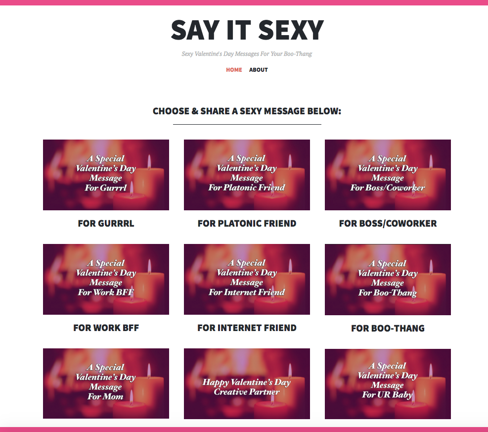 SayItSexy.net is oozing with sexy-sounding Valentine’s Day messages, ready to send to your special boo-thang — turning an ordinary “I love you” into a silky smooth “I loooove you babeh.”